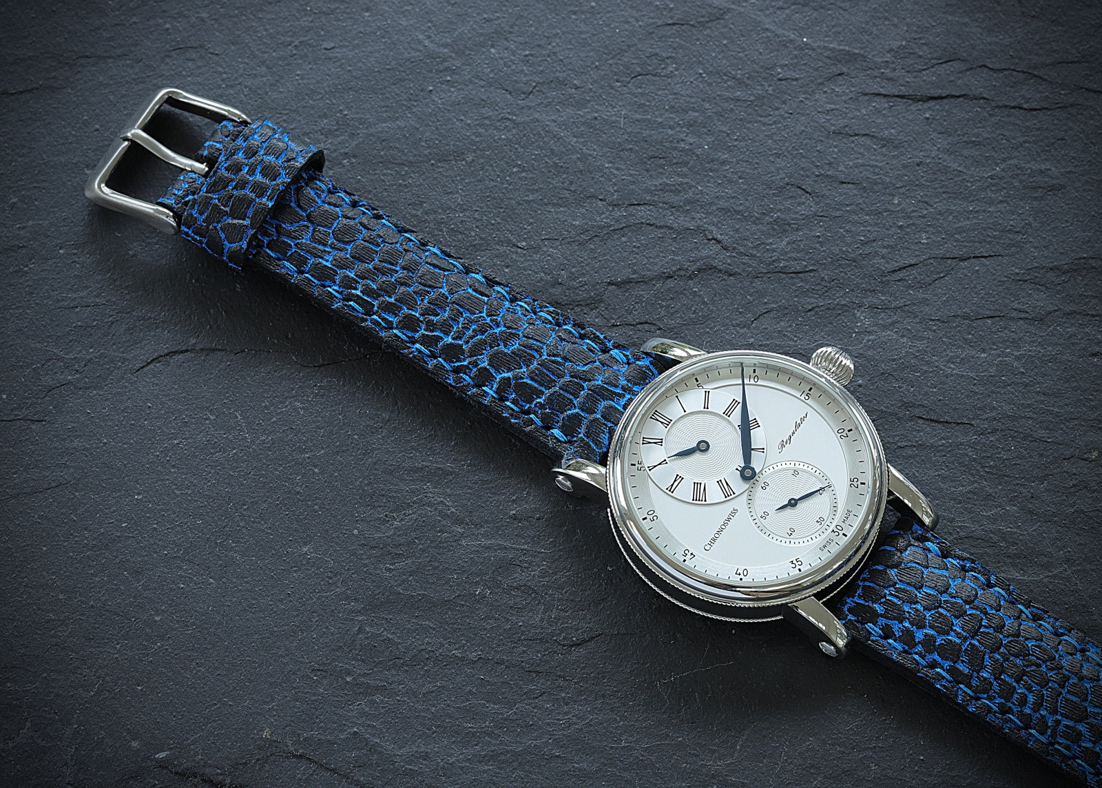 Die Uhr kommt im Fullset, Box und ausgefüllte Papiere sind komplett. Zusätzlich zum originalen Band an der Cronoswiss Faltschließe habe ich ein sensationelles, handgefertigtes Band von "Custom-Straps" montiert, das alleine einen Wert von 245,- Euro hat. Das Band ist Teil des Angebotes.