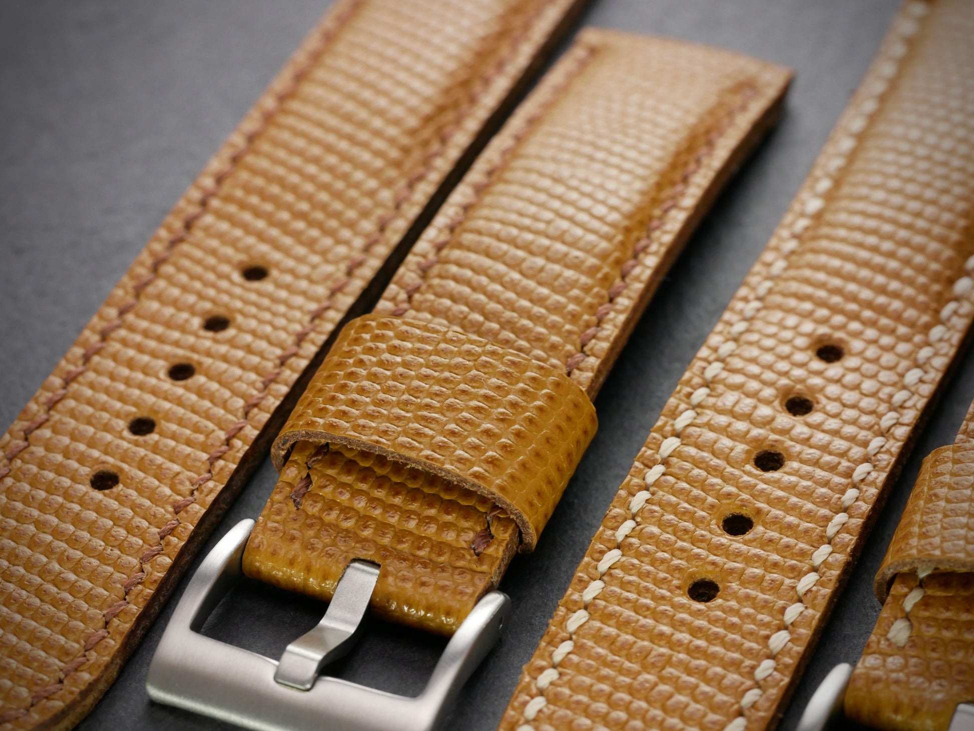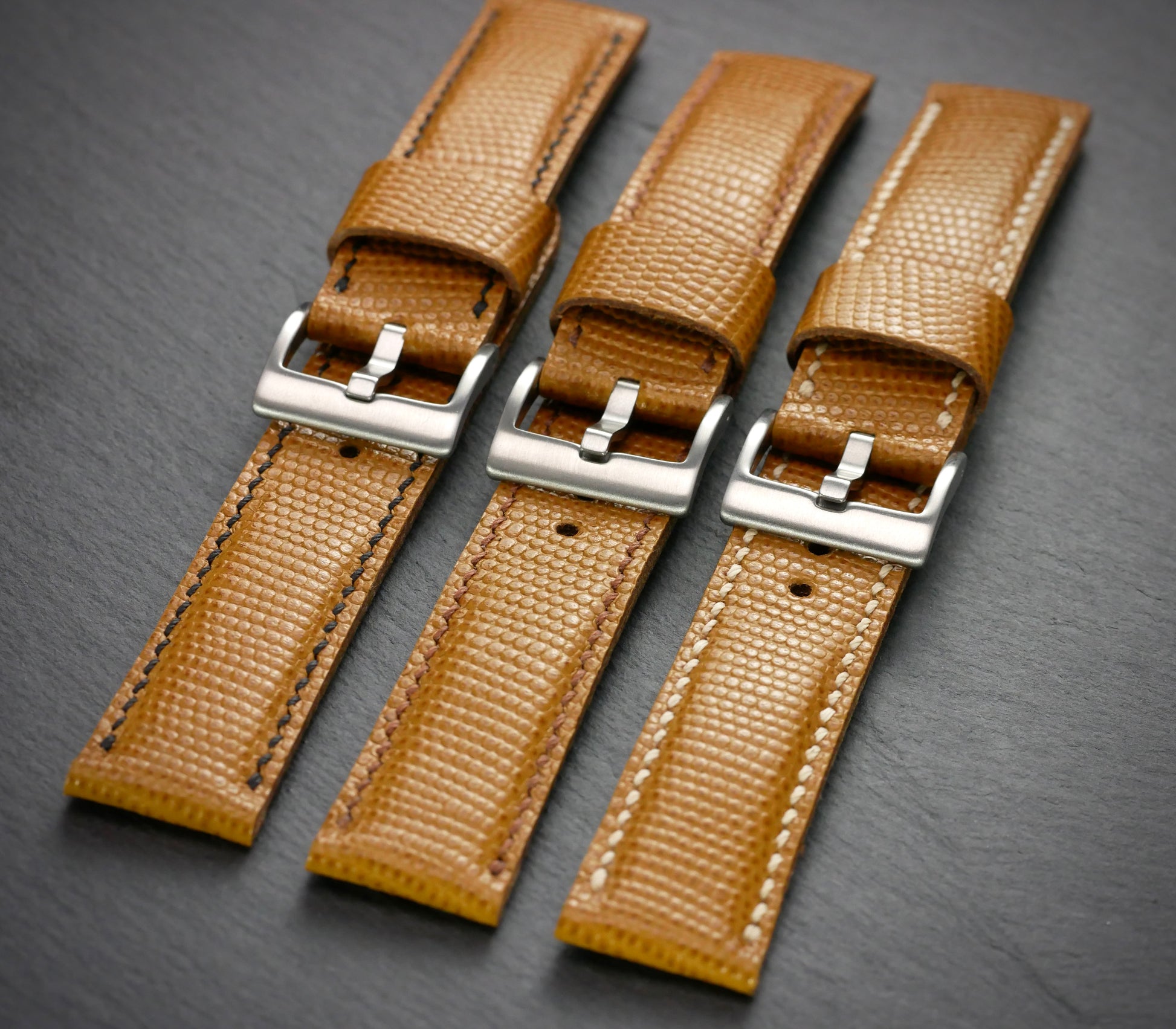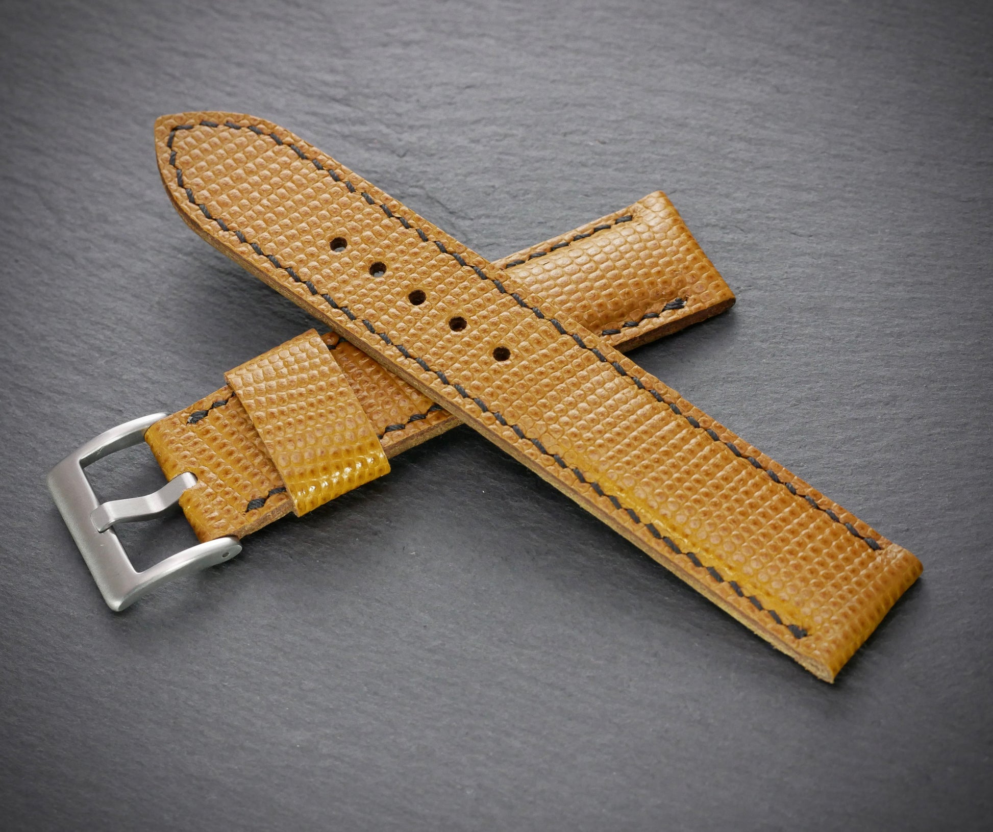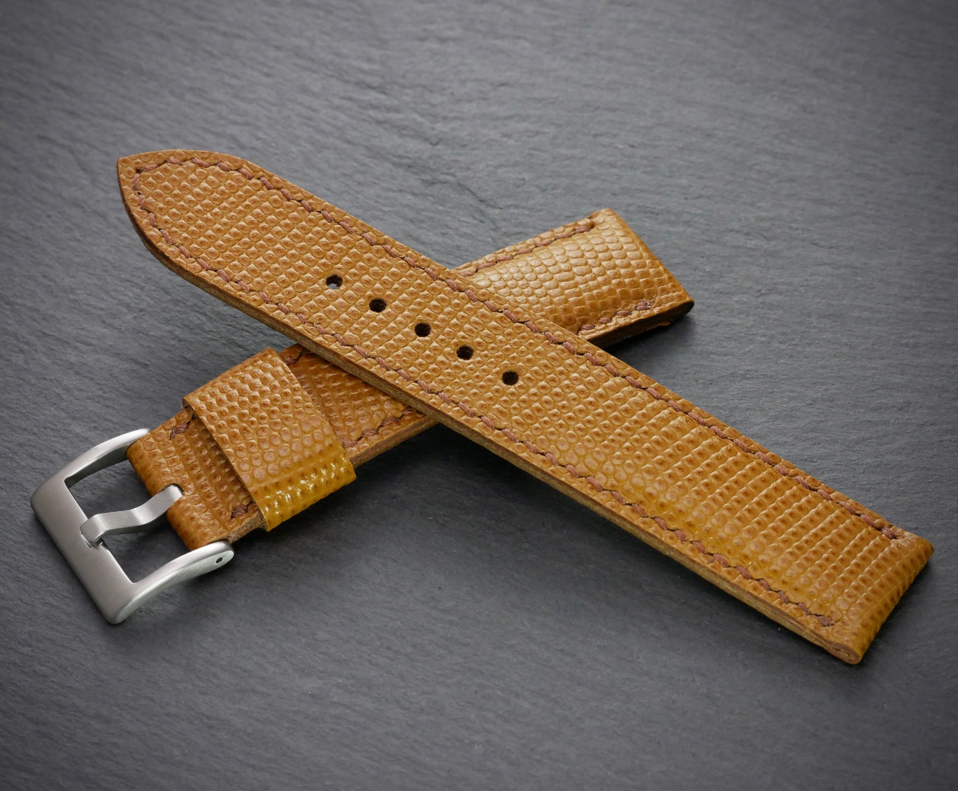 Aber nur fast, denn dieses Band ist aus feinstem italienischen Rindsleder - mit Eidechsen-Prägung. Das feine Muster beweist Stil und Zurückhaltung. Und ist mit dem Honigton fast zu jedem Zifferblatt kombiniertbar. Das Band ist bombiert (aufgepolstert) und somit auch an kräftigen Uhren gut tragbar