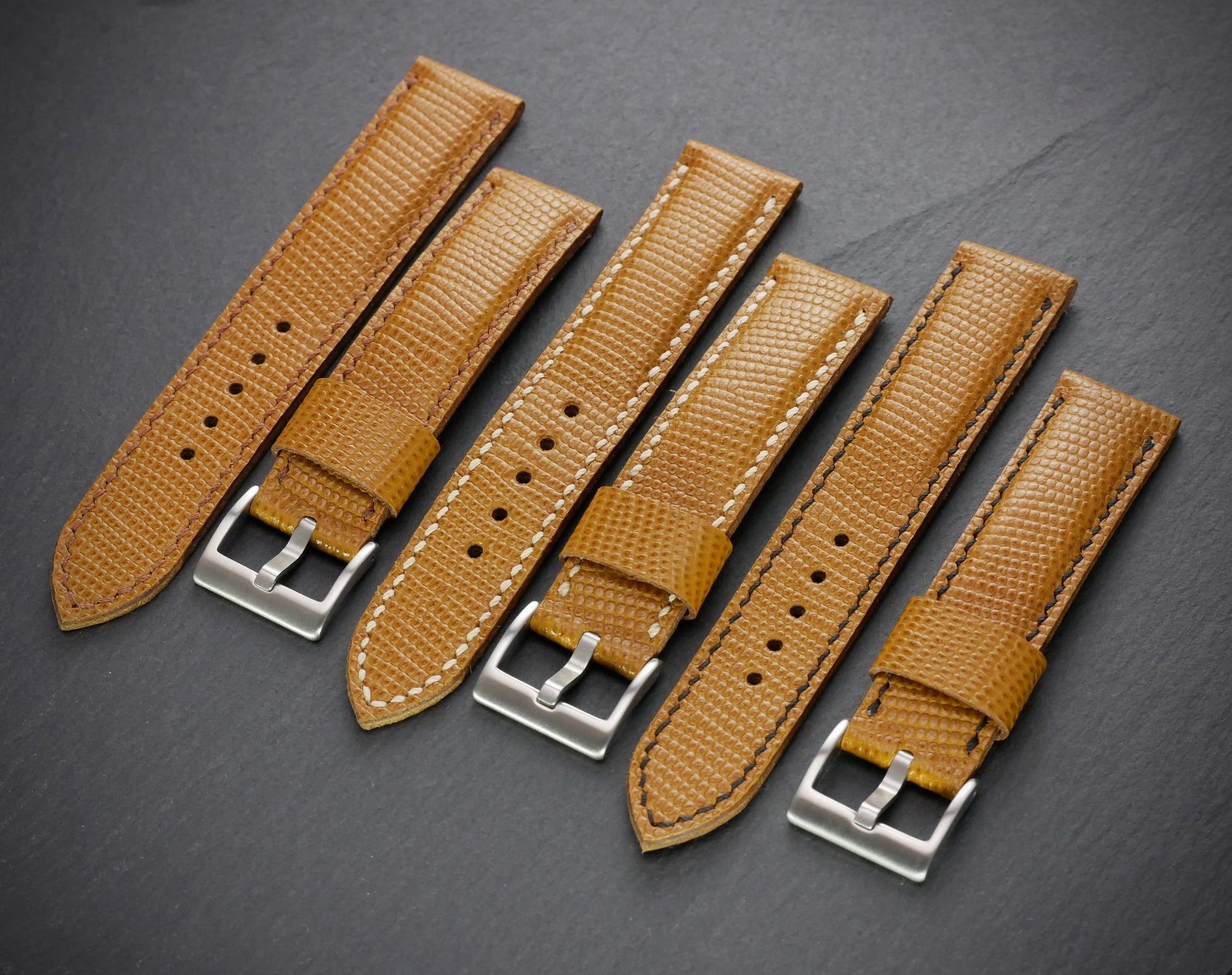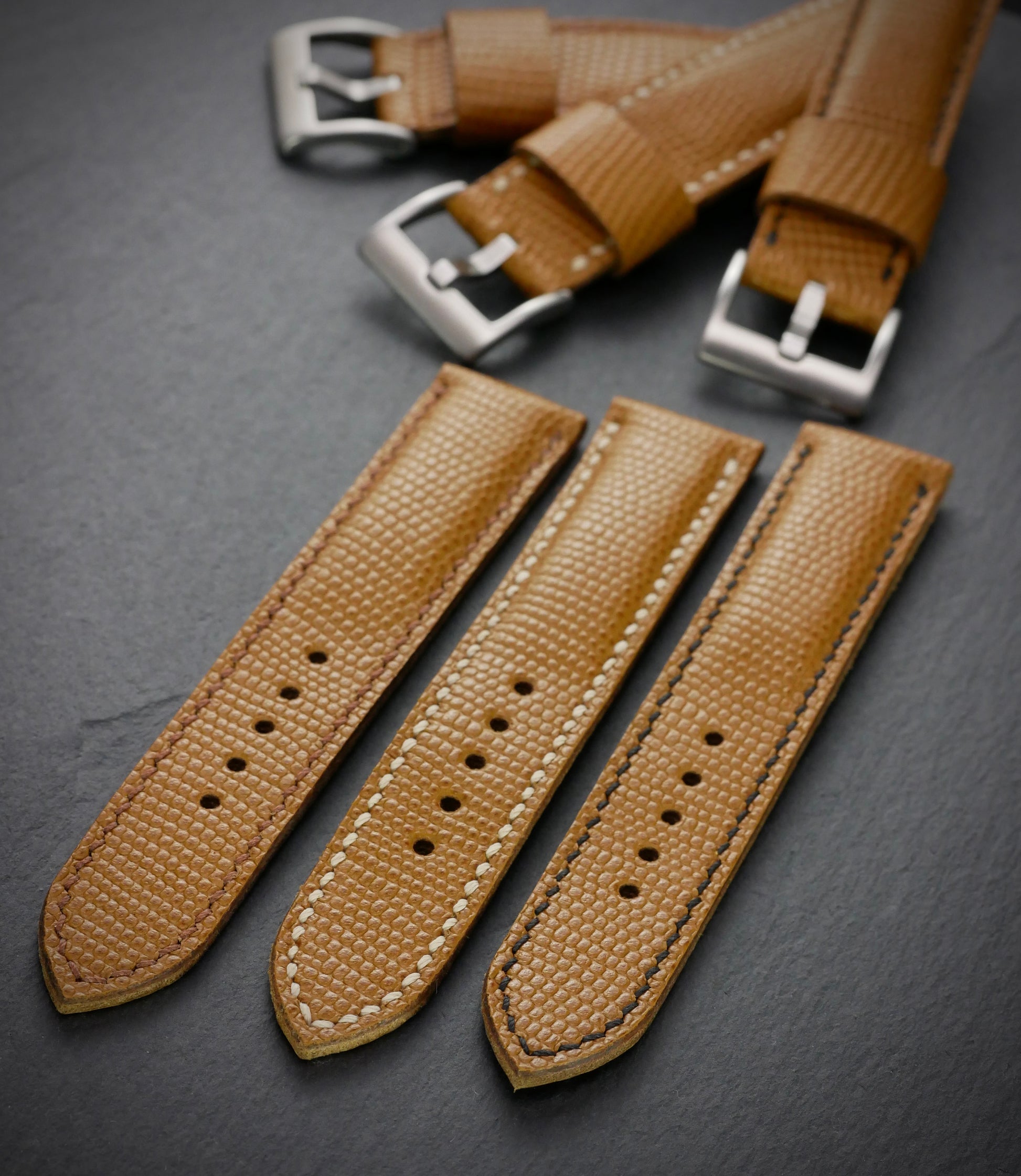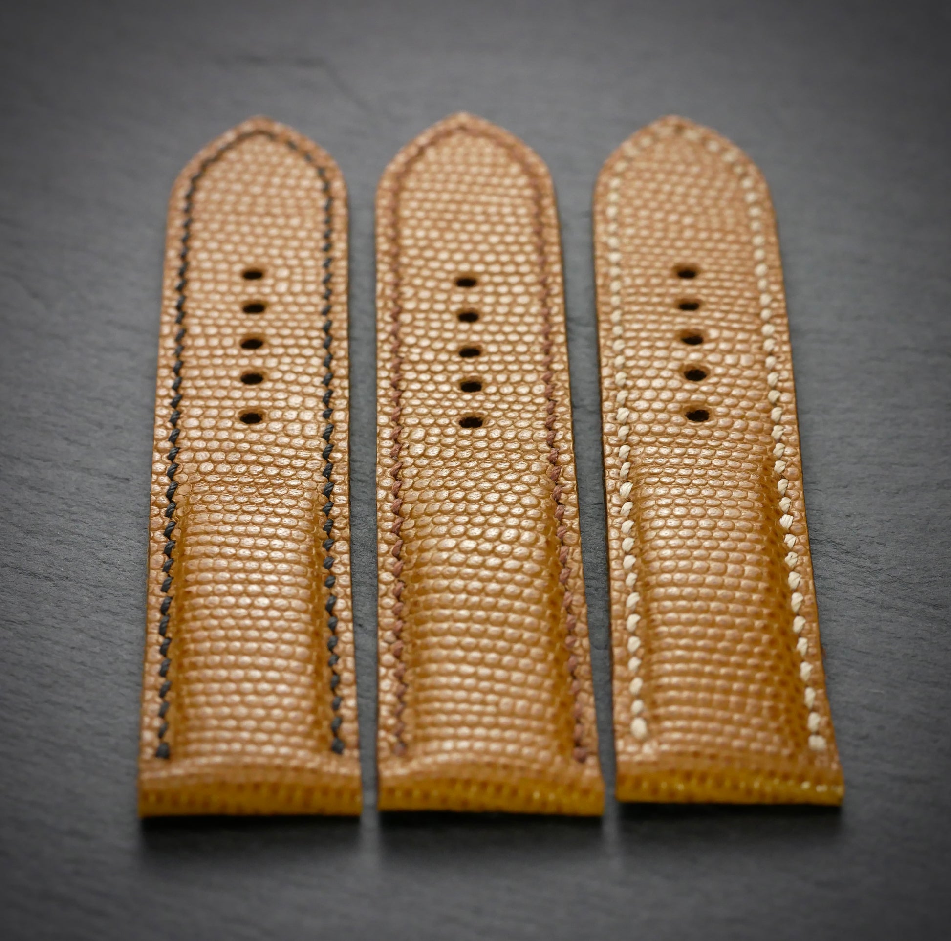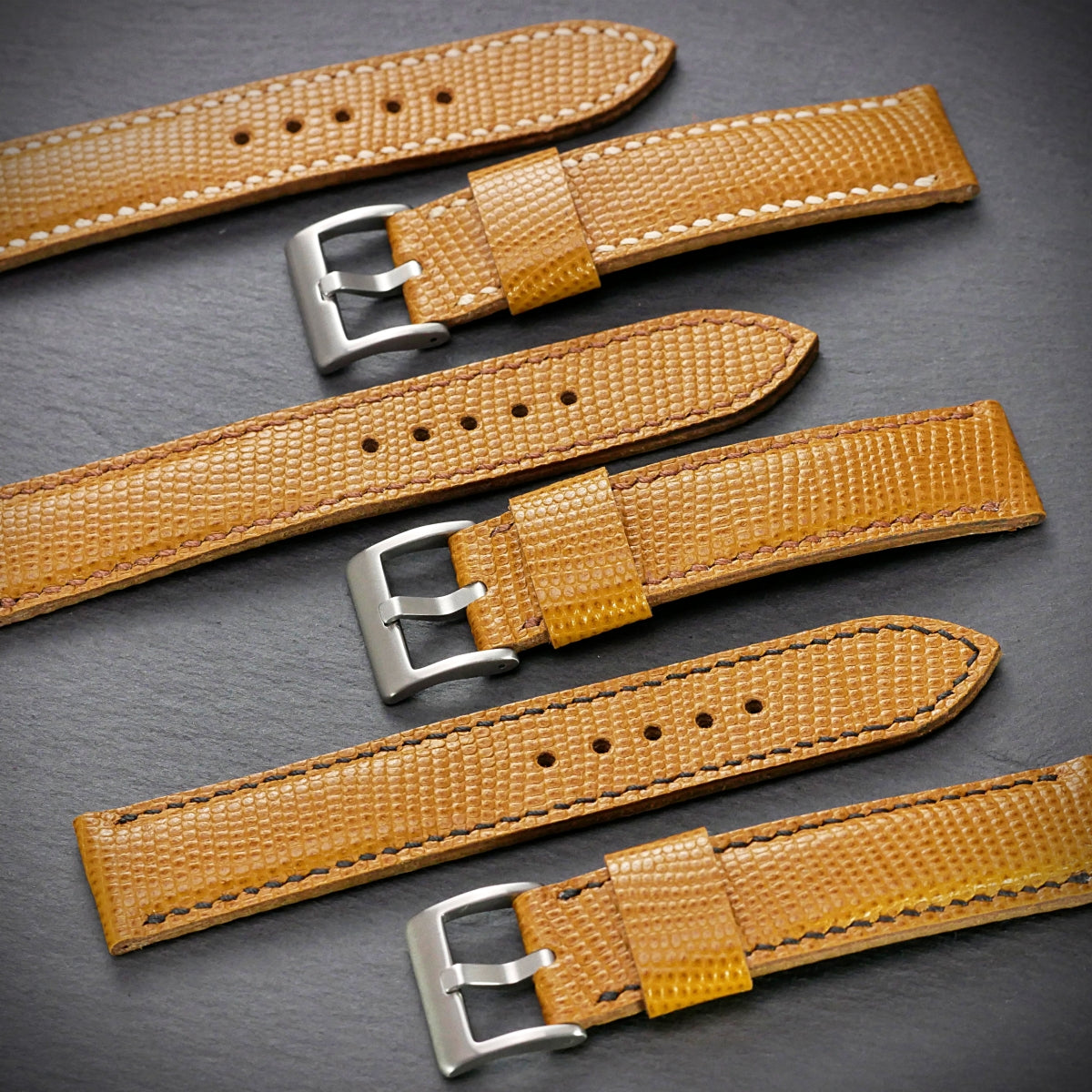 Aber nur fast, denn dieses Band ist aus feinstem italienischen Rindsleder - mit Eidechsen-Prägung. Das feine Muster beweist Stil und Zurückhaltung. Und ist mit dem Honigton fast zu jedem Zifferblatt kombiniertbar. Das Band ist bombiert (aufgepolstert) und somit auch an kräftigen Uhren gut tragbar