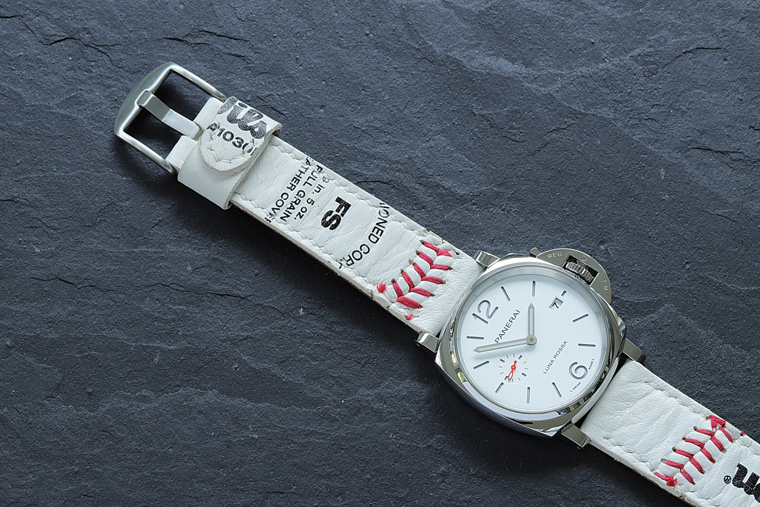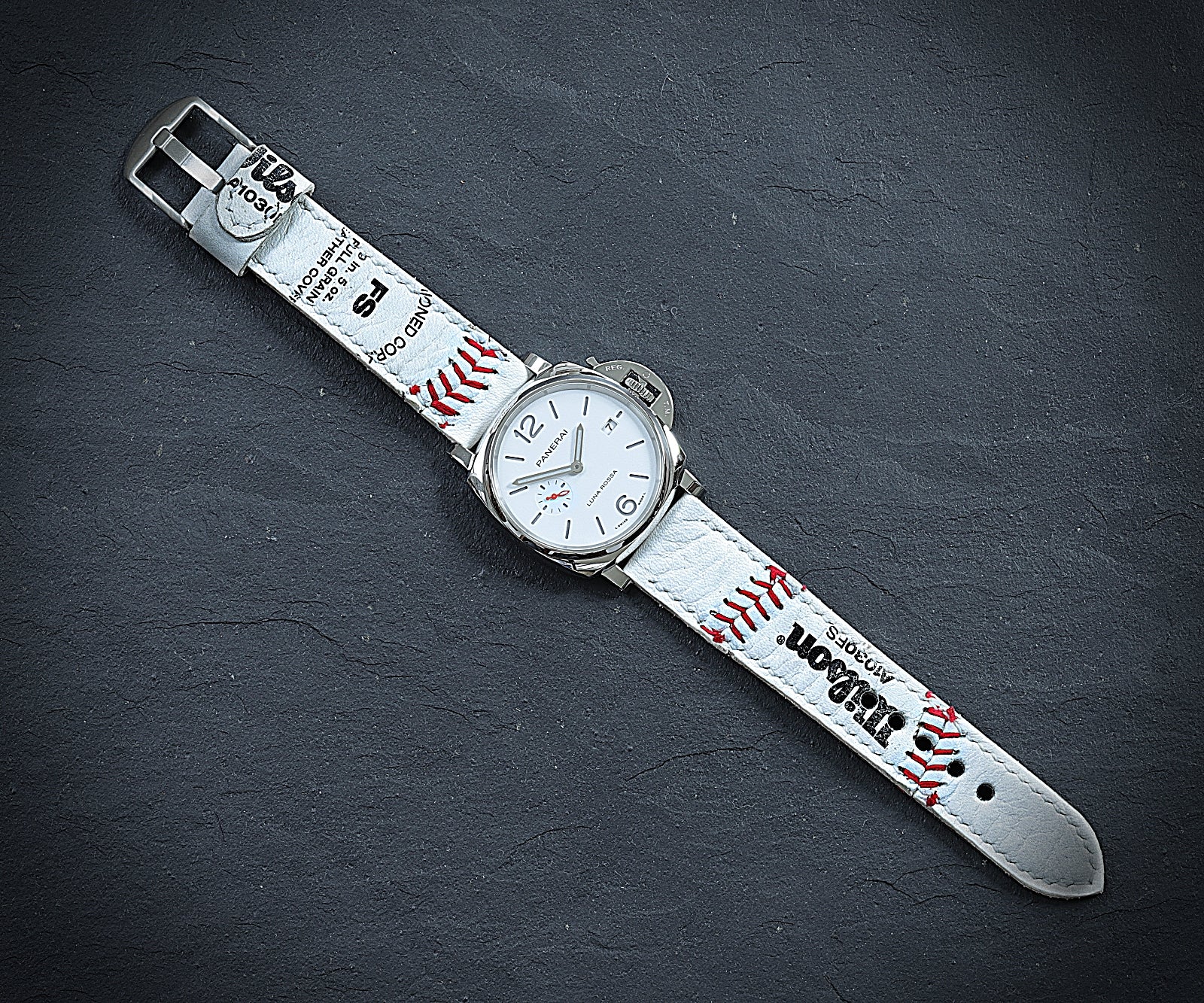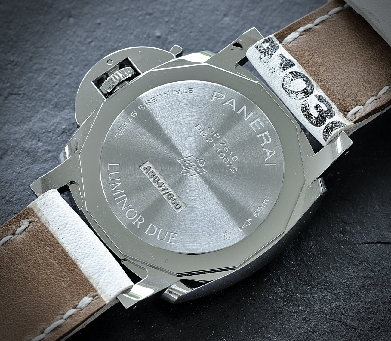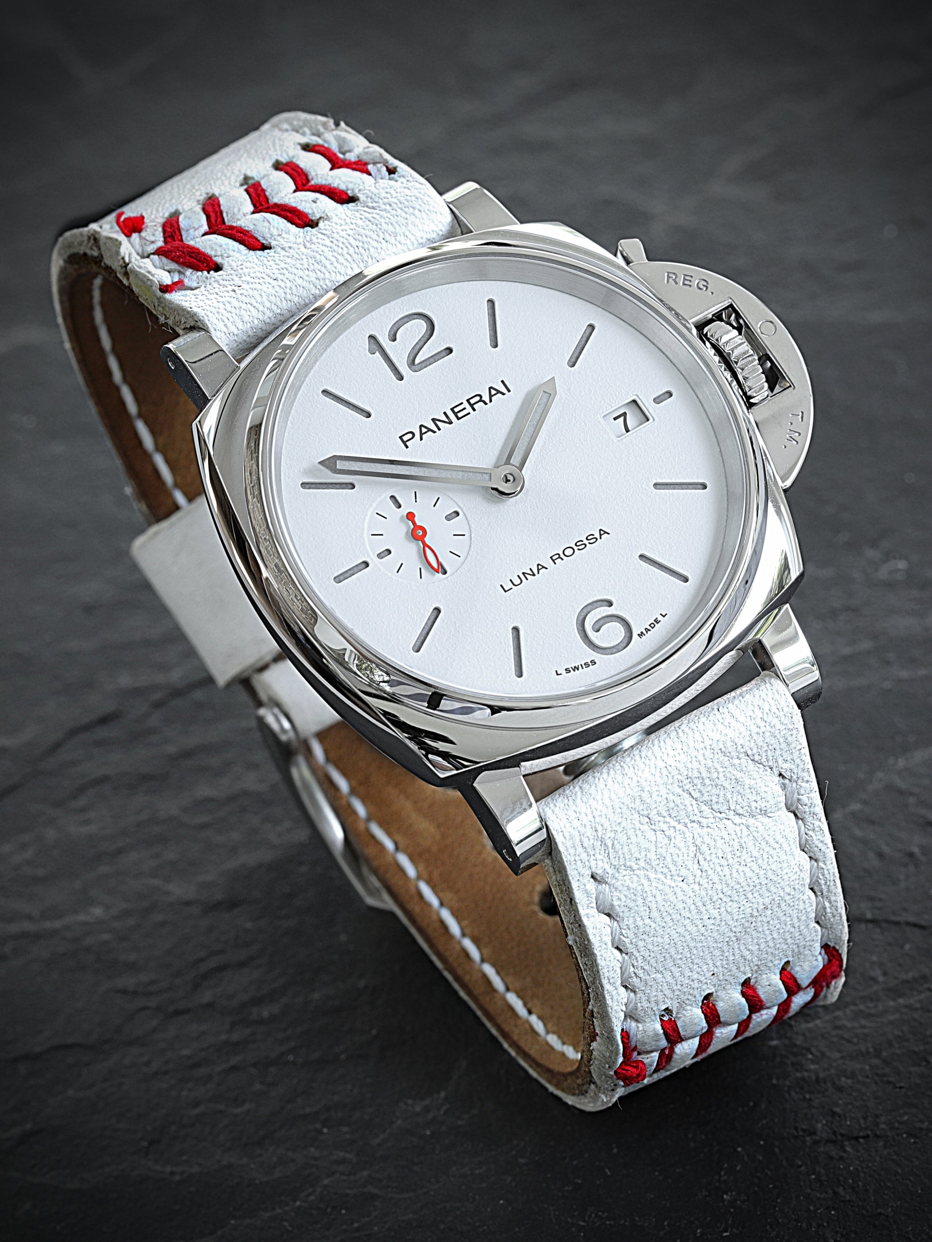 Das 42 mm Edelstahlgehäuse bietet dank der ikonischen Kronenschutzbrücke den unverwechselbaren Panerai-Charakter, während das weiße Zifferblatt mit applizierten Indexen eine maritime Tiefe vermittelt.