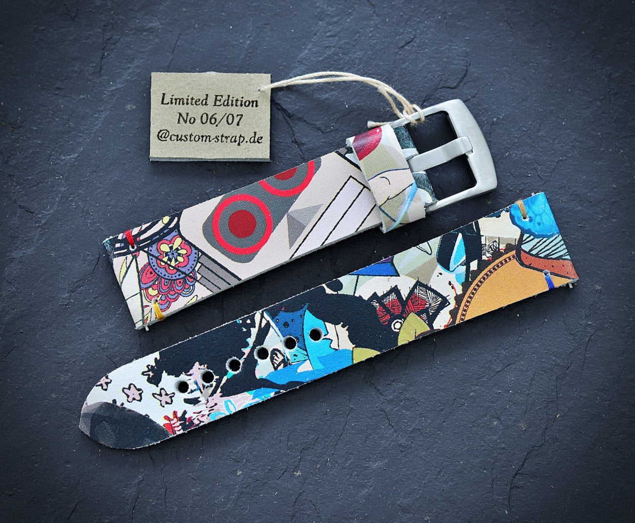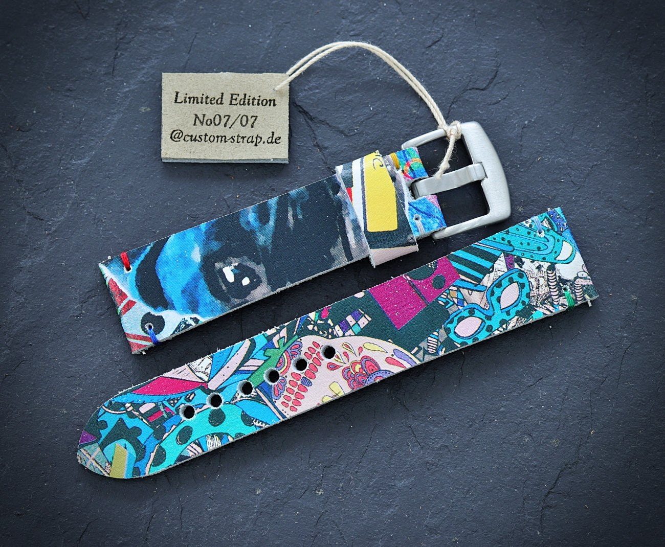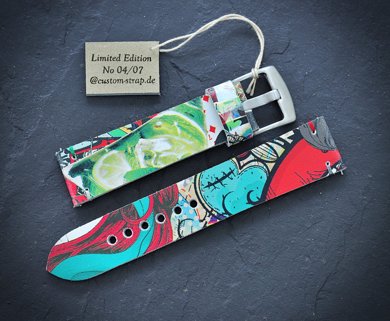 Die sieben Bänder der Pop Art Serie sind absolute Unikate. Geschnitten aus bedrucktem Leder, perfekt für den extrovertieren Auftritt am Handgelenk. Damit wird jeder langweilige Wecker zum Hingucker!