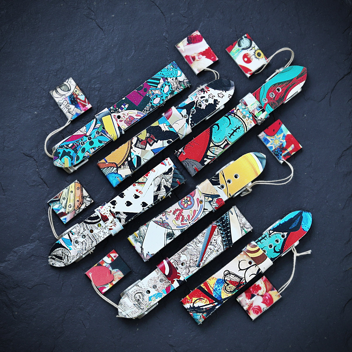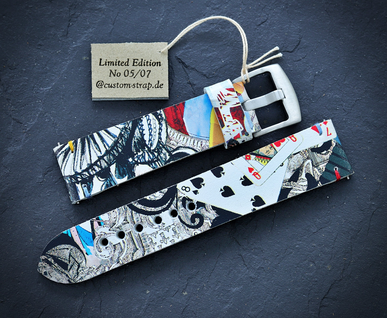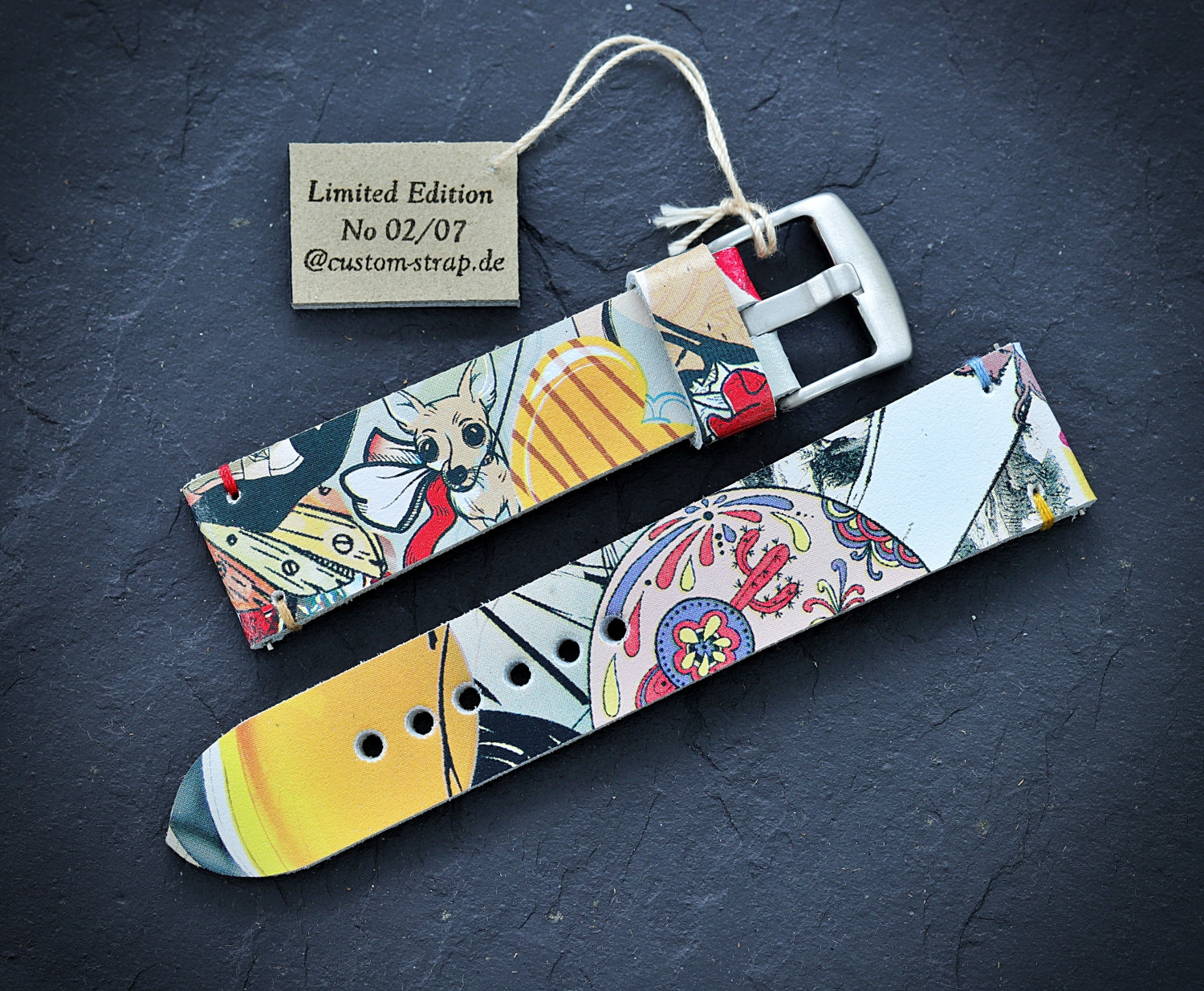Die sieben Bänder der Pop Art Serie sind absolute Unikate. Geschnitten aus bedrucktem Leder, perfekt für den extrovertieren Auftritt am Handgelenk. Damit wird jeder langweilige Wecker zum Hingucker!