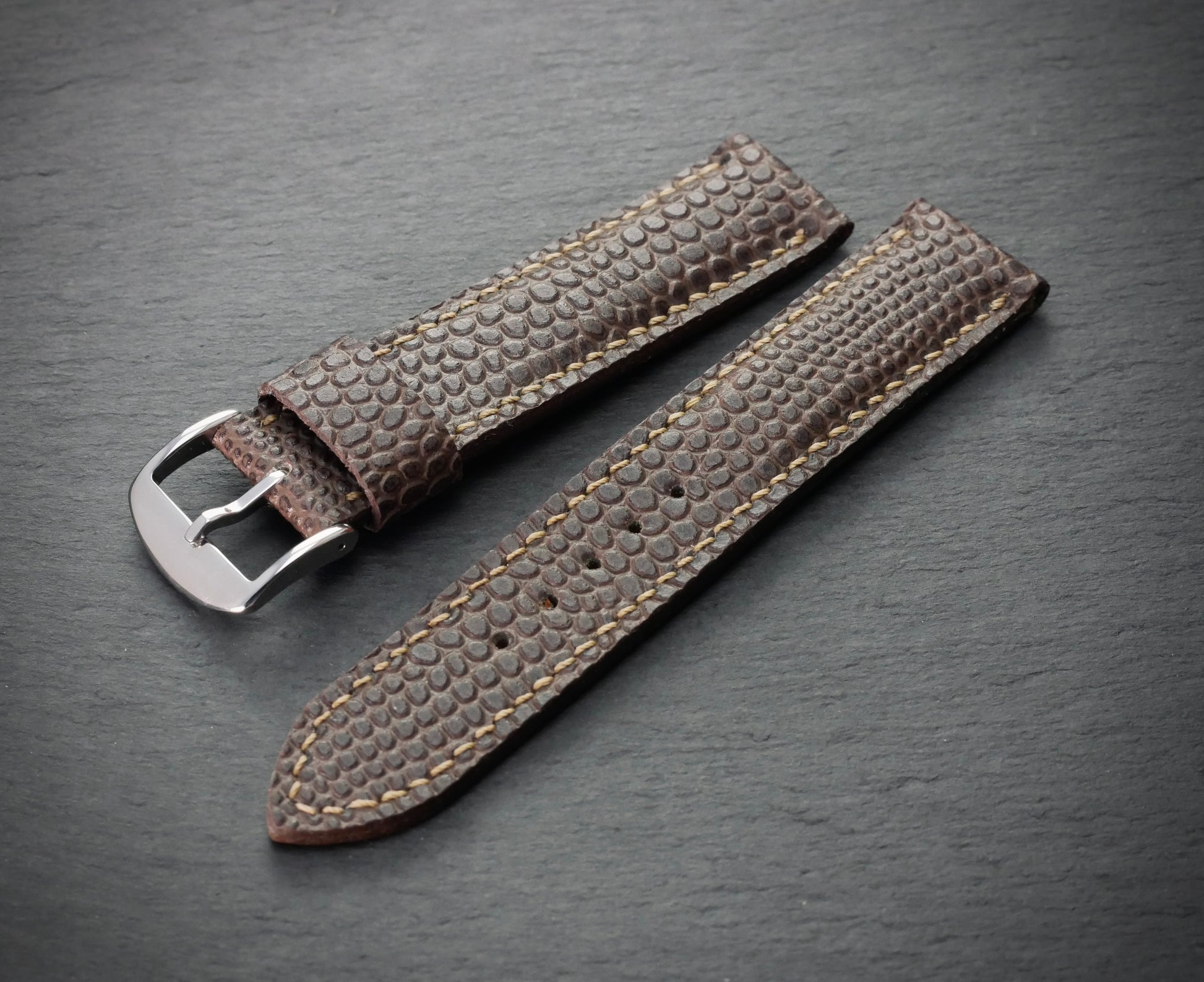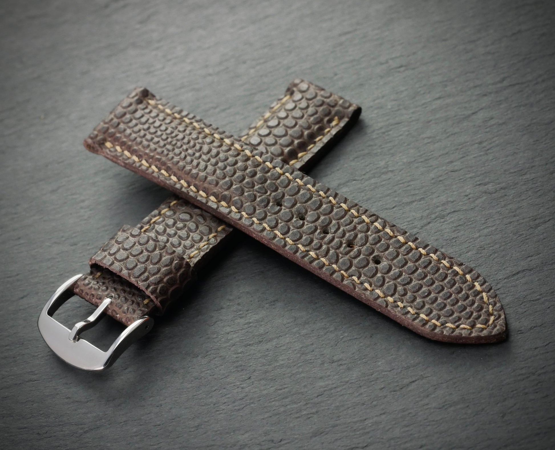 Der Schein trügt: Was auf den ersten Moment aussieht wie Perlrochen, ist in Wirklichkeit geprägtes Kalbsleder. Bombiertes (aufgepolstertes) Band, eingefärbt in edlem Braun mit heller Naht. Ideal für Uhren mit einem Gehäuse aus Gelbgold oder Bronze.